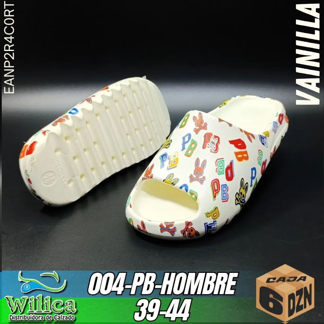 🩴 La sandalia 004-PB-HOMBRE ofrece un diseño gráfico con personajes y letras sobre base blanca. Ideal para uso urbano y casual. Tallas del 39 al 44.