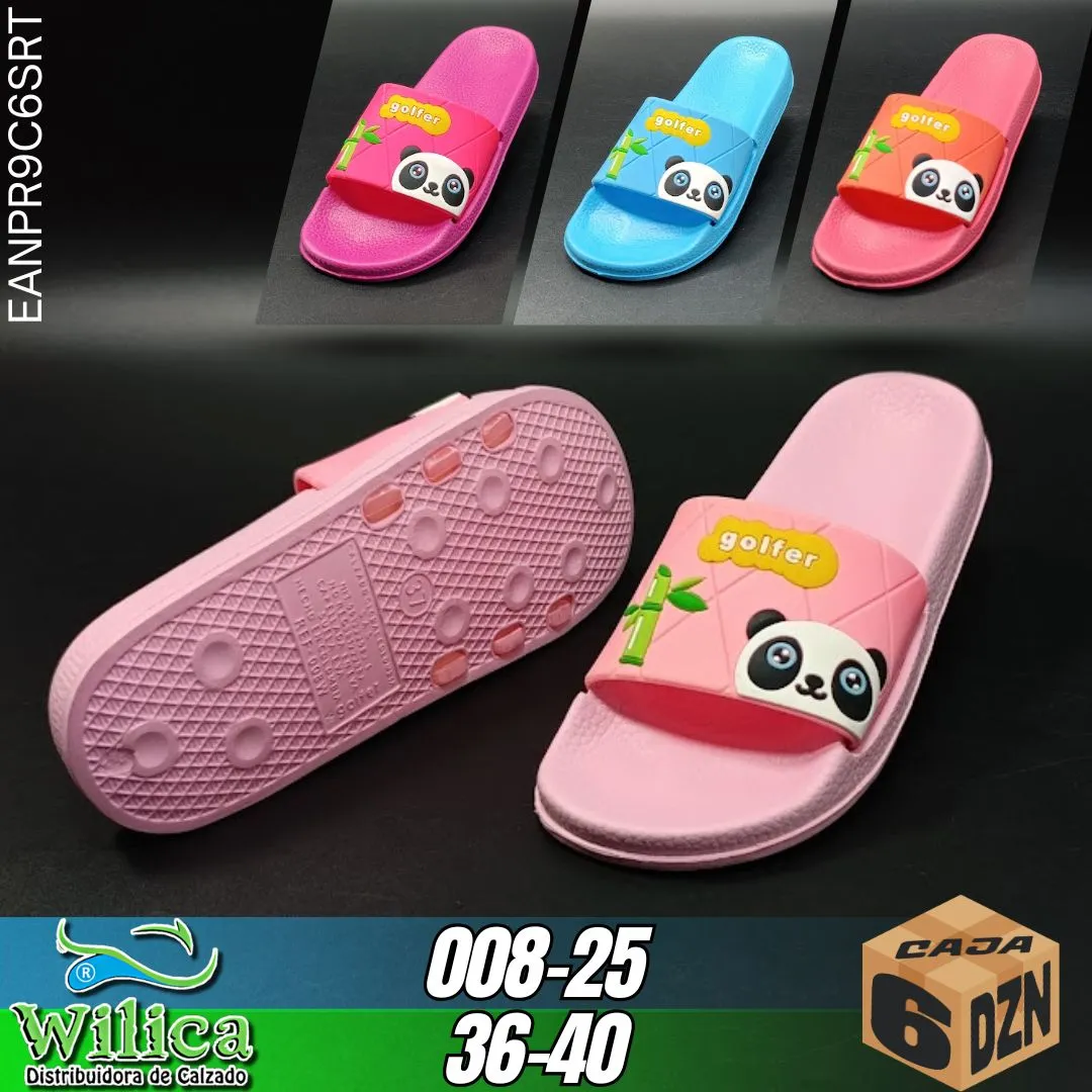 El modelo 008-25 presenta un diseño infantil con carita de panda y detalles de bambú. Ideal para quienes buscan comodidad con estilo juguetón. Tallas del 36 al 40.