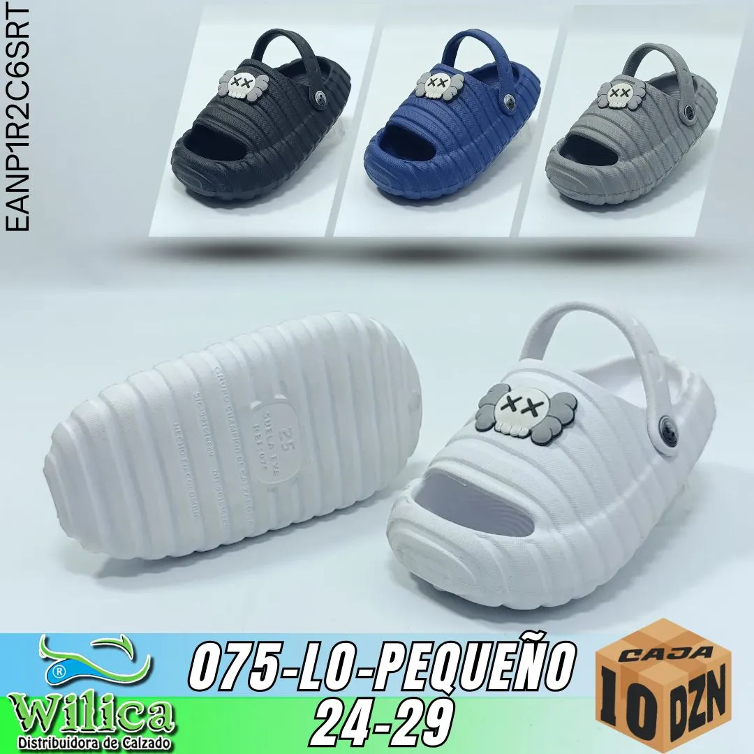 ☁️ El modelo 075-LO-PEQUEÑO presenta un diseño con textura acanalada y decoración de emblemas infantiles como nubes, frutas y estrellas. Ideal para niños que buscan calzado cómodo y divertido.