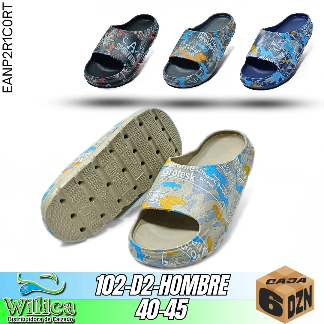 El modelo 102-D2-HOMBRE presenta un diseño gráfico y suela drenante. Ideal para quienes buscan estilo y funcionalidad. Tallas del 40 al 45.
