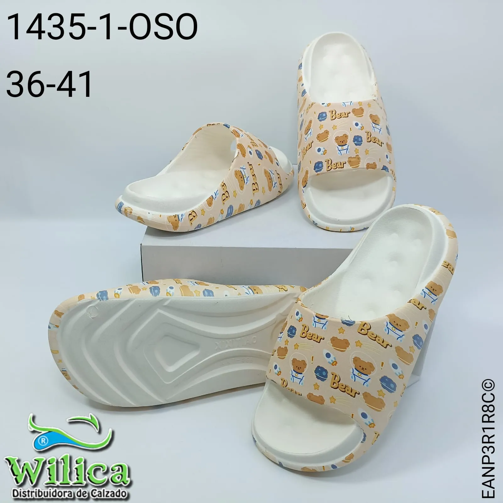 🐻 El modelo 1435-1-OSO presenta un diseño con ilustraciones de ositos, huellas y texto “Bear”. Ideal para quienes buscan calzado cómodo con estilo tierno y gráfico