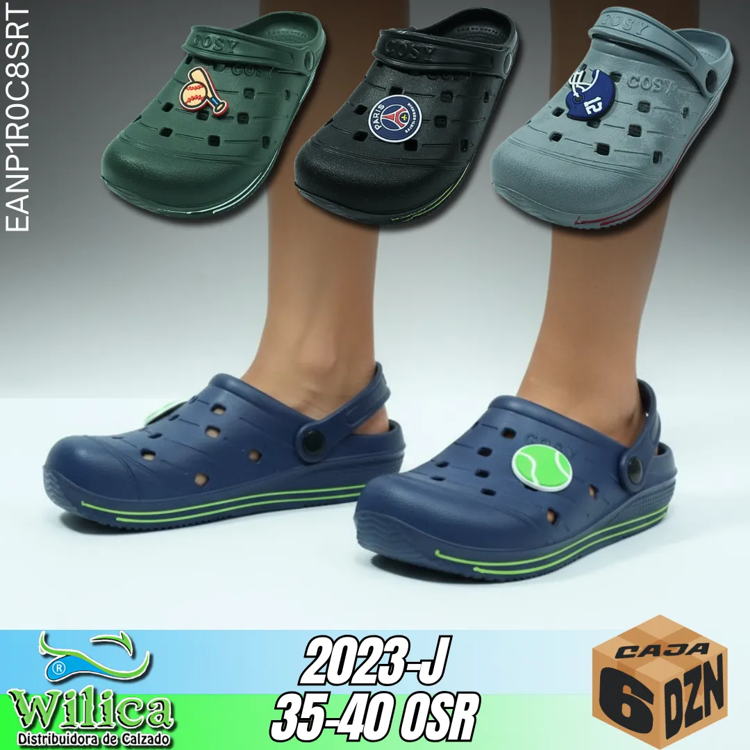 🎾 El modelo 2023-J presenta un diseño con ventilación, correa trasera y charms deportivos. Ideal para quienes buscan calzado cómodo con estilo activo y decorativo.