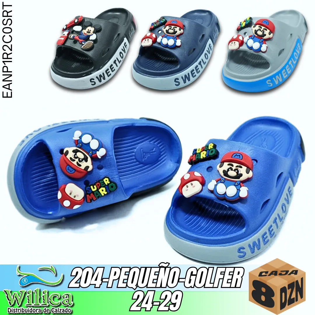 El modelo 204-PEQUEÑO-GOLFER presenta un diseño decorado con personajes gráficos y suela impresa. Ideal para quienes buscan calzado cómodo y temático. Tallas del 24 al 29.