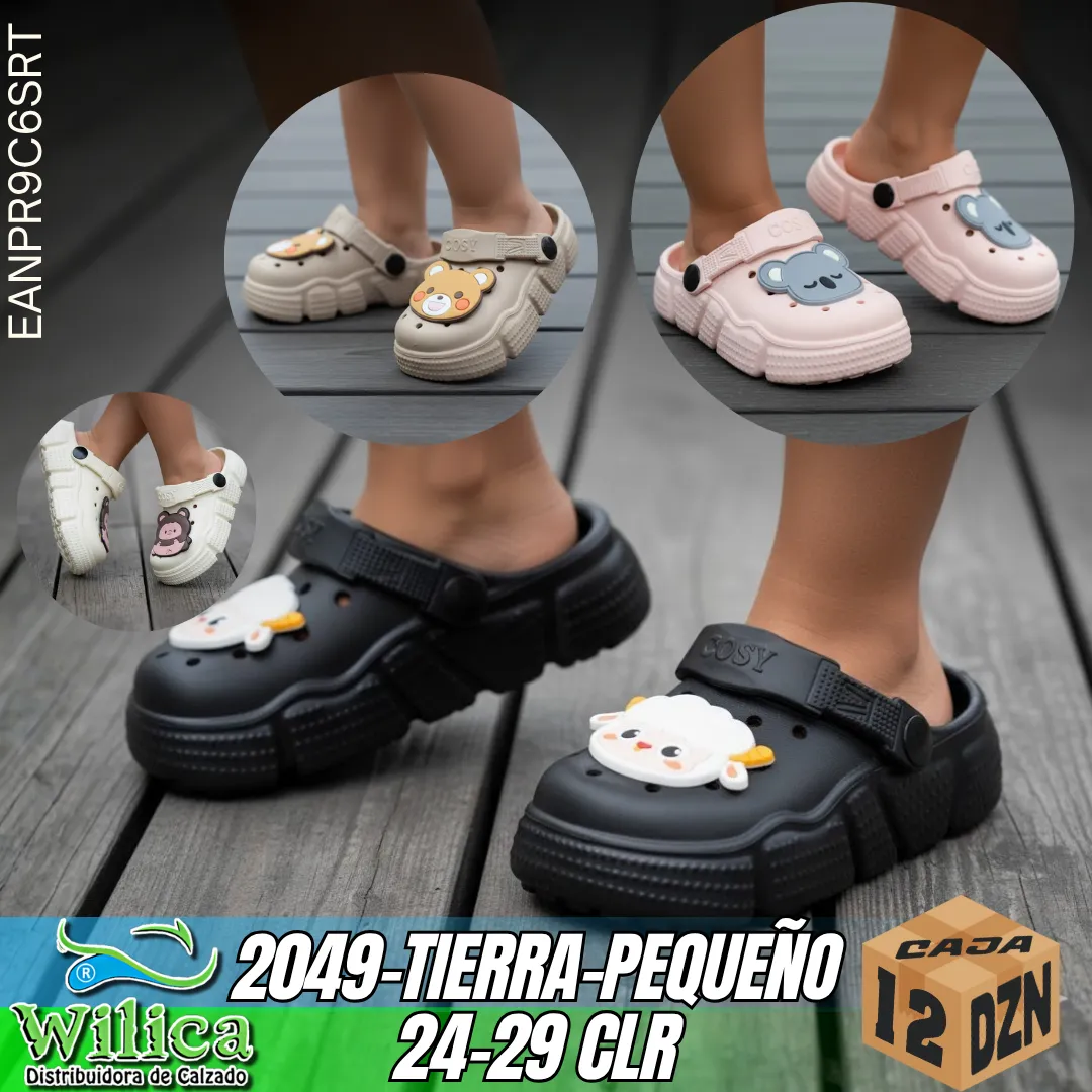 👡 El modelo 2049-TIERRA-PEQUEÑO presenta un diseño infantil con decoraciones de animales y correa marcada “COSY”. Ideal para niños pequeños que buscan comodidad y diversión.
