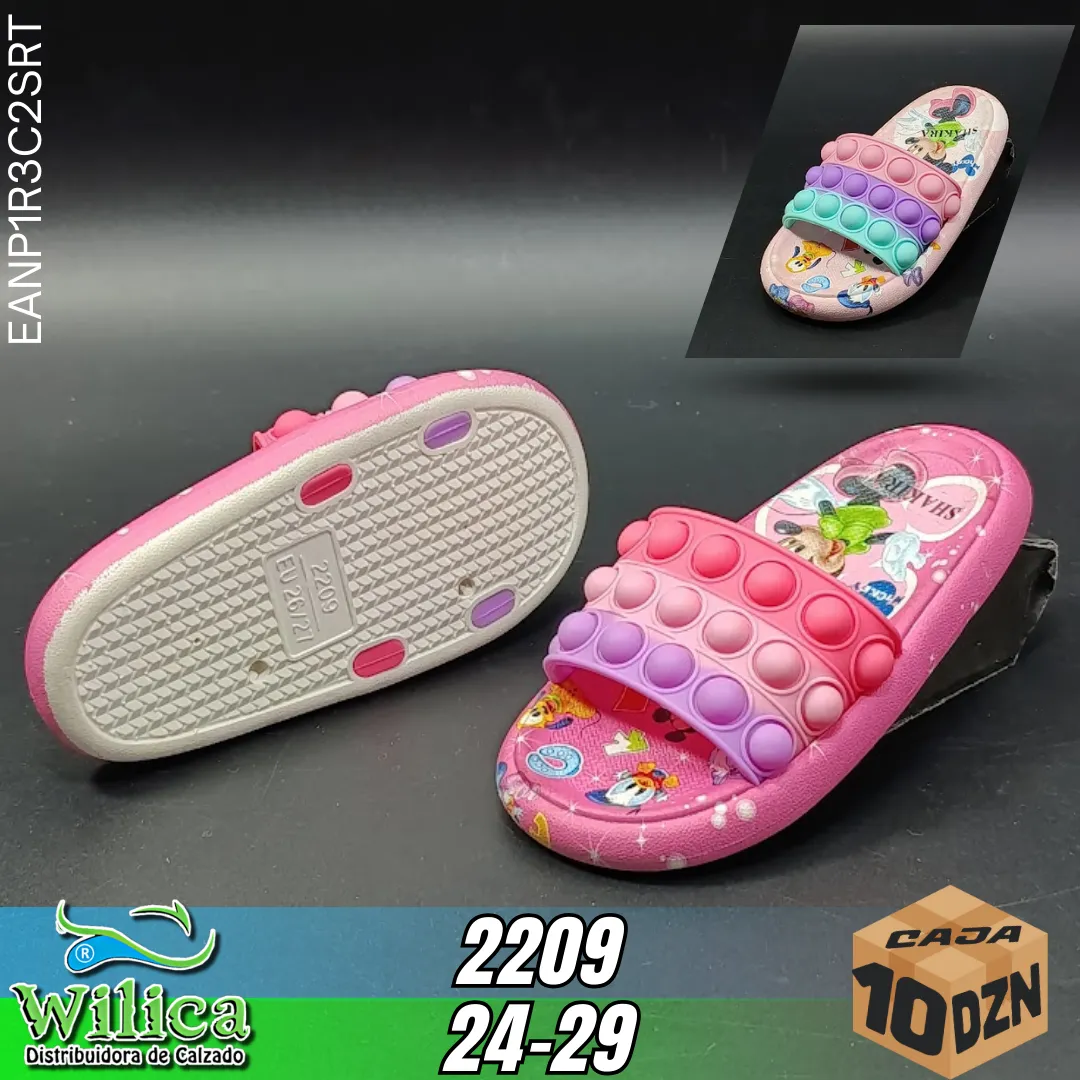 🌈 El modelo 2209 presenta un diseño con correa estilo pop-it y plantilla decorada con personajes. Ideal para niños que buscan calzado cómodo con estilo sensorial y divertido.