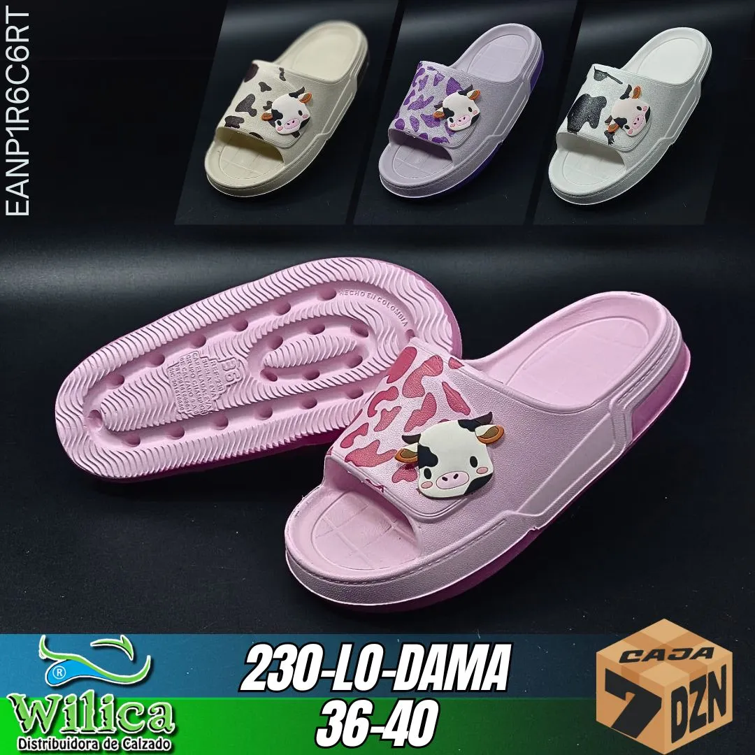 🐮 El modelo 230-LO-DAMA presenta un diseño decorado con carita de vaquita y patrón de manchas. Ideal para quienes buscan calzado cómodo con estilo juguetón.