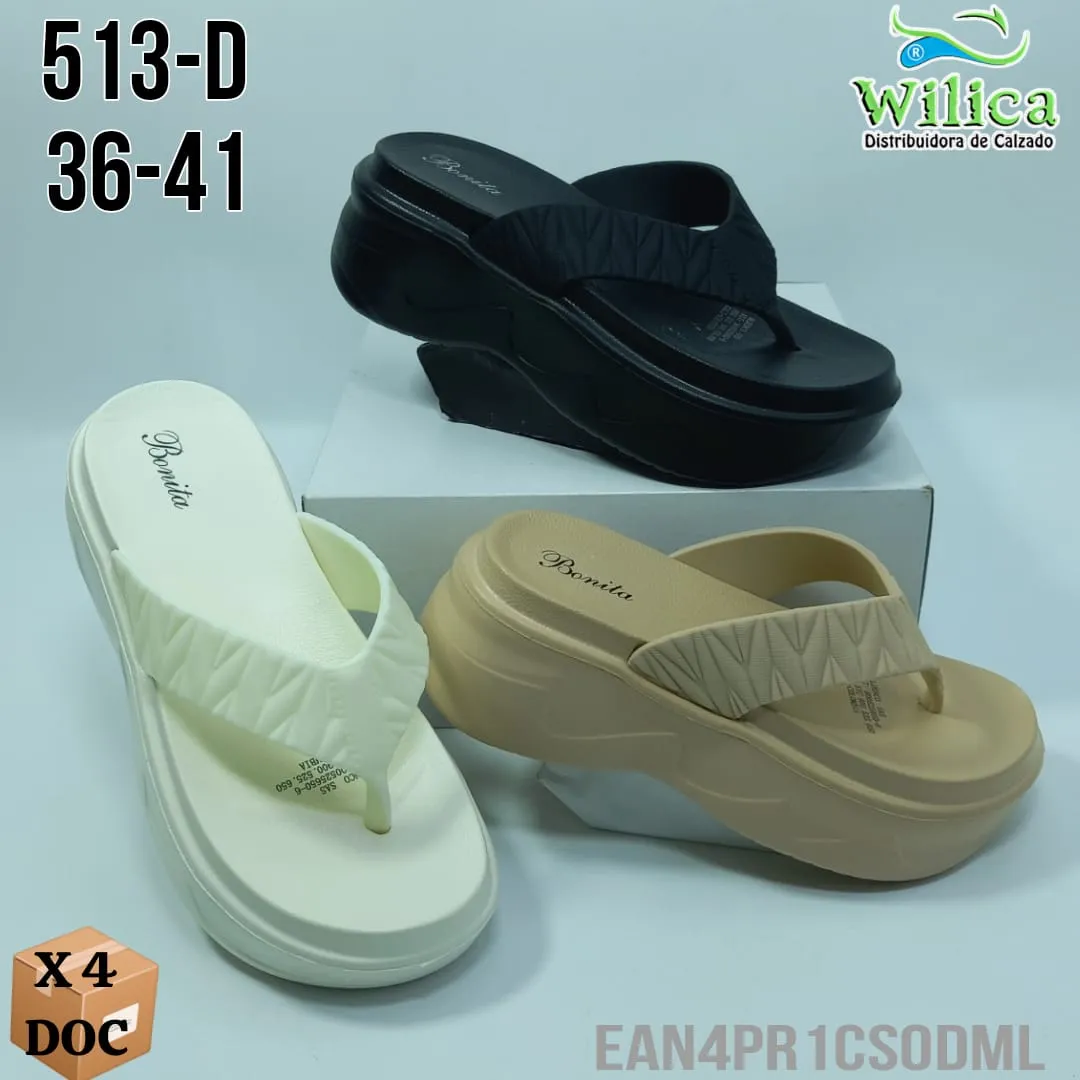 Sandalia 513-D, perfecta para el uso diario gracias a su diseño moderno y plataforma cómoda. Cuenta con tiras texturizadas elegantes y una suela resistente que brinda estabilidad y confort. Disponible en tallas 36-41 y en colores negro, beige y blanco. 📦 Caja de 4 docenas.