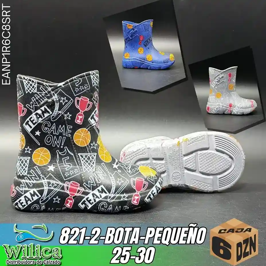 La referencia 821-2-BOTA-PEQUEÑO está pensada para uso recreativo y escolar. Su suela con agarre y decoración deportiva la convierten en una opción segura y llamativa.