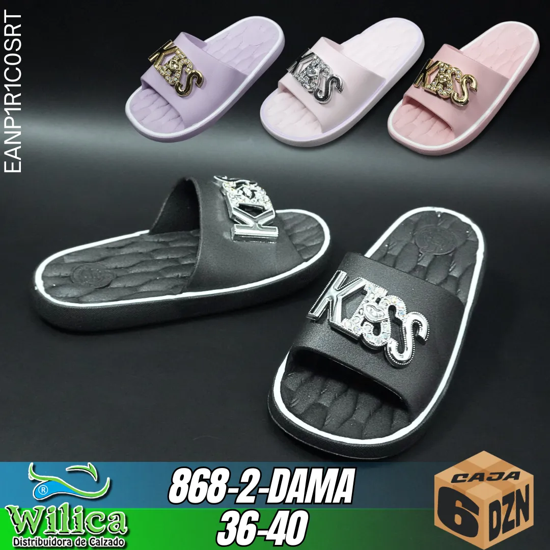 👡 El modelo 868-2-DAMA presenta un diseño con correa ancha y letras metálicas “KISS”. Perfecto para mujeres que buscan comodidad y un estilo llamativo.