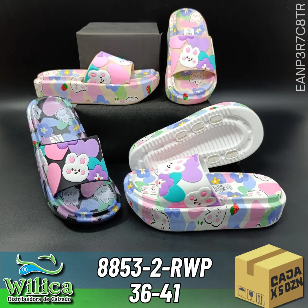 🐰 El modelo 8853-2-RWP presenta un diseño decorado con personajes caricaturescos, frutas y flores. Ideal para quienes buscan calzado cómodo con estilo tierno y divertido.