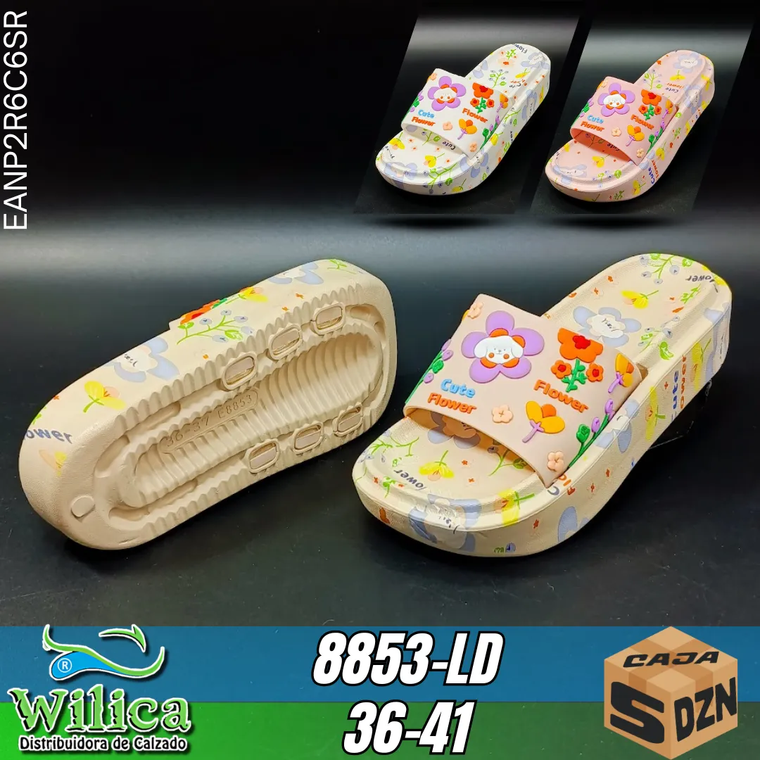 🌼 El modelo 8853-LD presenta un diseño decorado con flores sonrientes y gráficos tipo cartoon. Ideal para quienes buscan calzado cómodo con estilo divertido.