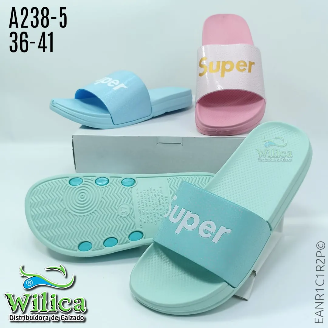 🟢 El modelo A238-5 presenta un diseño pastel con texto “SUPER” en la correa. Ideal para quienes buscan calzado cómodo con estilo juvenil.
