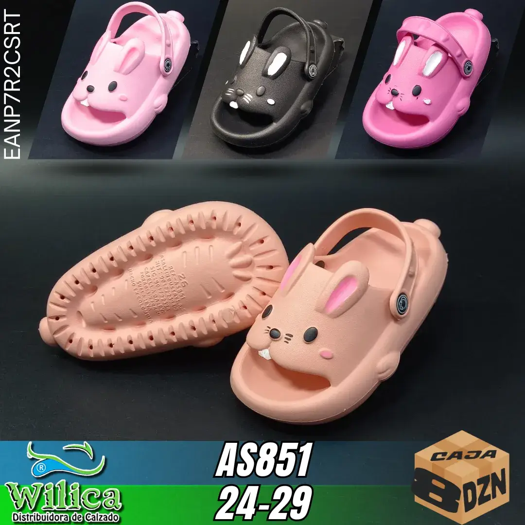 🐰 El modelo AS851 presenta un diseño decorado con carita de conejo, orejas y nariz. Ideal para niños pequeños que buscan calzado divertido y seguro.