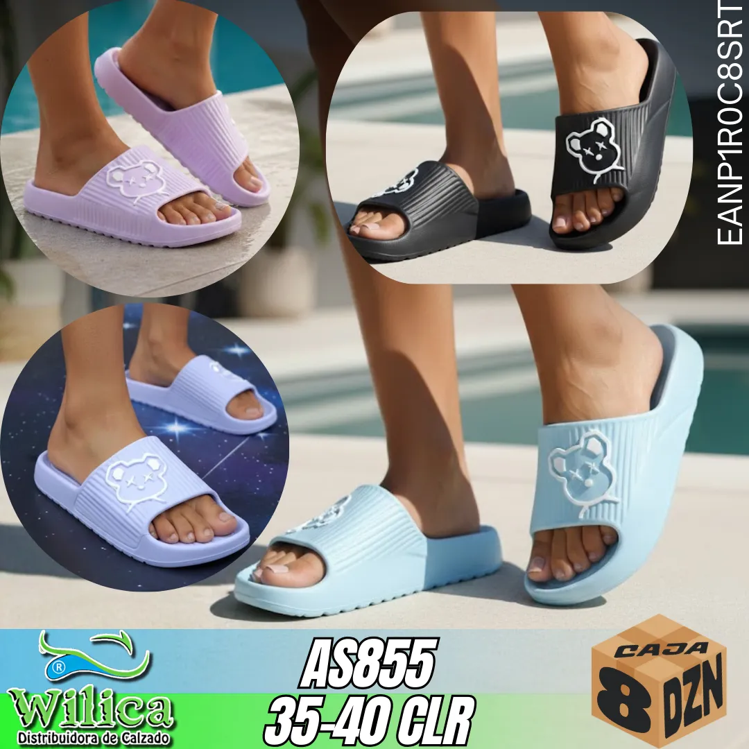 🐻 El modelo AS855 presenta un diseño juvenil con decoración de osito en la parte superior y variedad de colores, acompañado de suela ligera. Ideal para quienes buscan comodidad y estilo simpático.