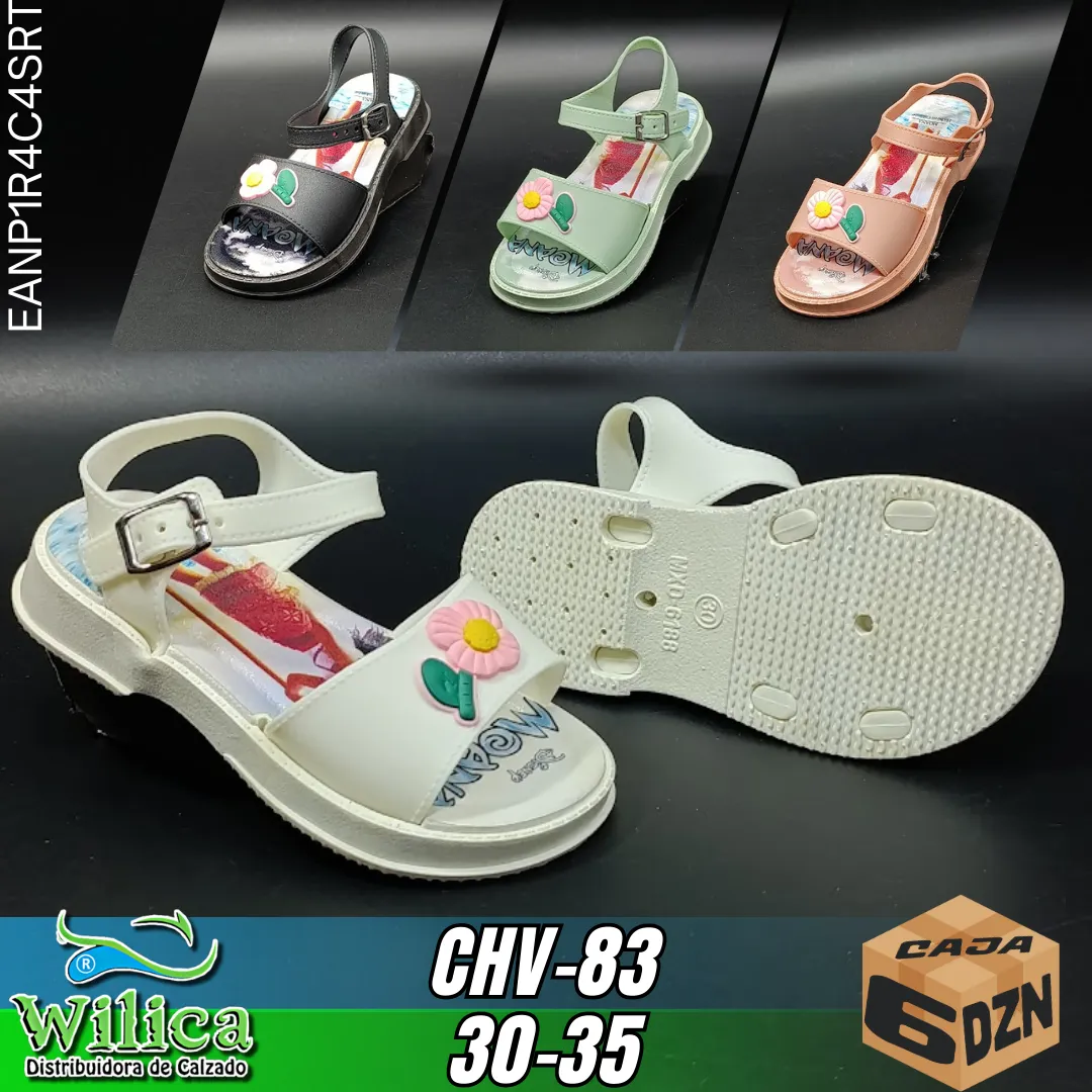 🍃 El modelo CHV-83 presenta un diseño decorado con flor y hoja sobre correa. Ideal para niñas que buscan calzado cómodo con estilo natural y divertido.