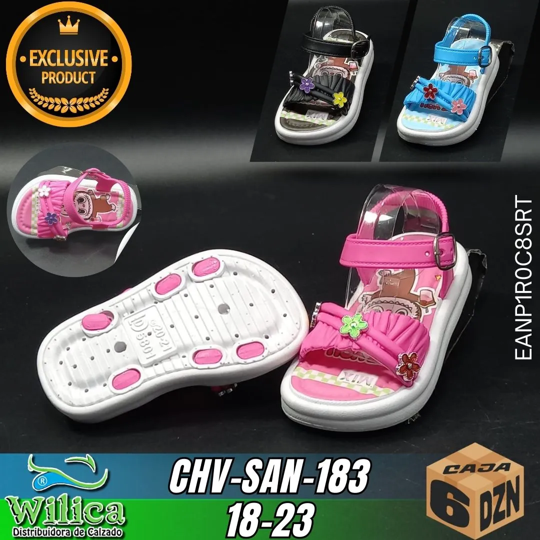 🌸 El modelo CHV-SAN-183 presenta un diseño decorado con flor en relieve y personaje ilustrado en la plantilla. Ideal para niñas que buscan calzado cómodo con estilo alegre y colorido.