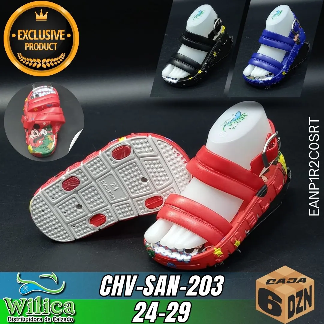 🐭 El modelo CHV-SAN-203 presenta un diseño decorado con personaje y suela texturizada. Ideal para niños que buscan calzado cómodo con estilo clásico y divertido.