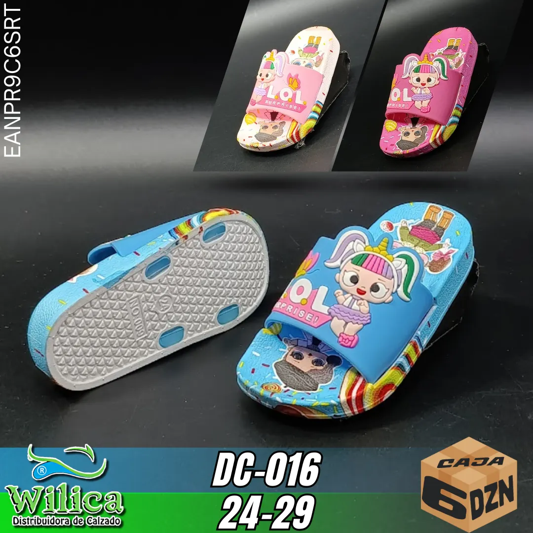 🎀 El modelo DC-016 presenta un diseño decorado con personajes en la correa y plantilla. Ideal para niñas que buscan calzado cómodo con estilo juguetón y colorido.