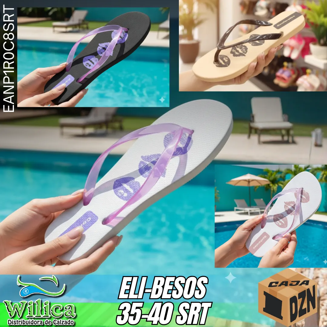 💋 El modelo ELI-BESOS combina estampados de labios con tonos suaves y correas translúcidas. Ideal para quienes buscan un diseño coqueto y relajado.