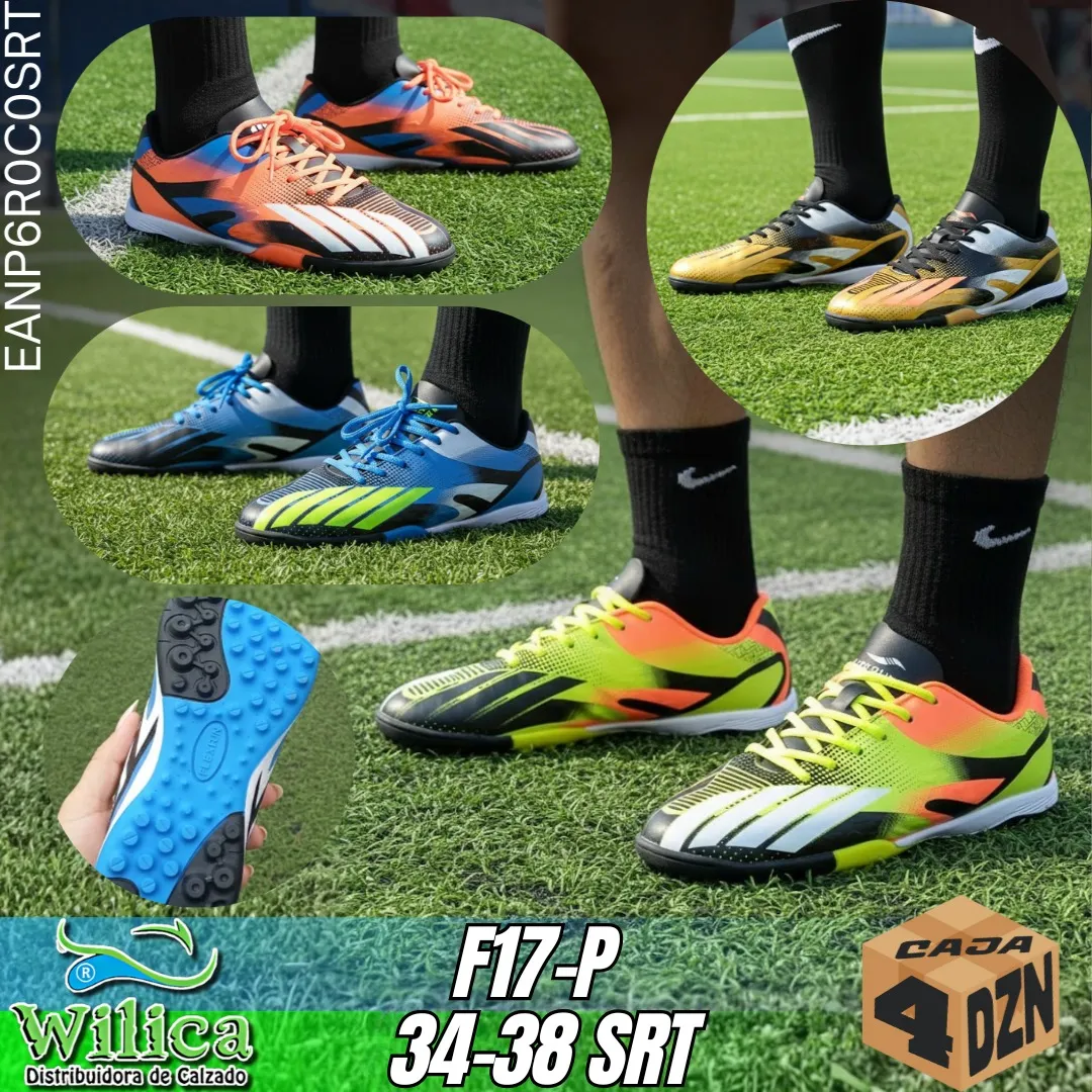 ⚽ El modelo F17-P presenta un diseño deportivo con colores vibrantes y suela con tacos para mejor tracción en cancha. Ideal para quienes buscan rendimiento y estilo juvenil.