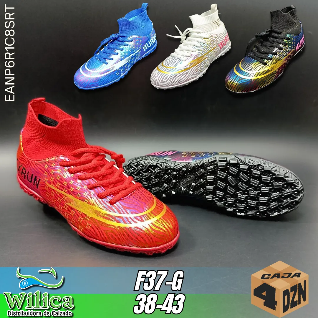 ⚽Los tacos deportivos F37-G ofrecen un diseño vibrante y alto rendimiento. Con cuello alto y suela con tacos, son ideales para fútbol en cancha sintética. Tallas del 38 al 43.