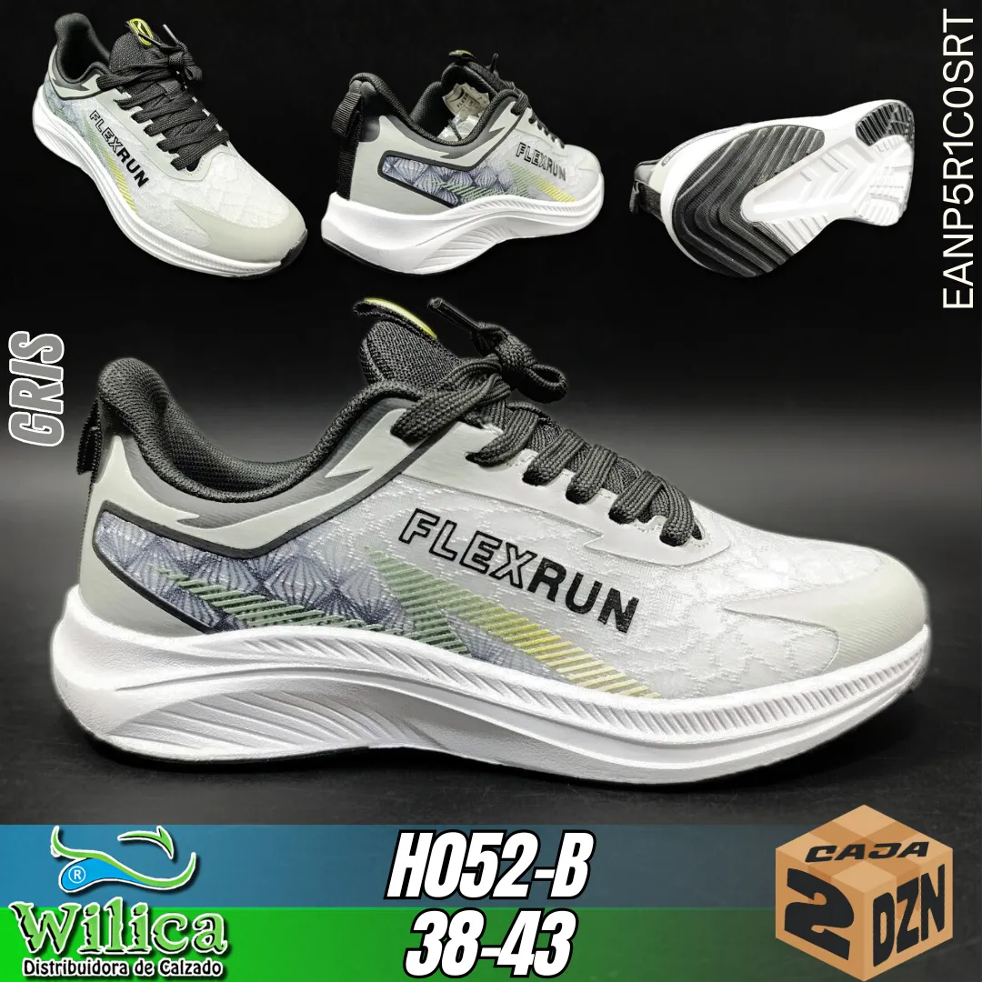 💛 El modelo H052-B presenta un diseño en color gris con detalles amarillos en los laterales, acompañado de suela blanca texturizada. Ideal para quienes buscan comodidad y estilo llamativo.