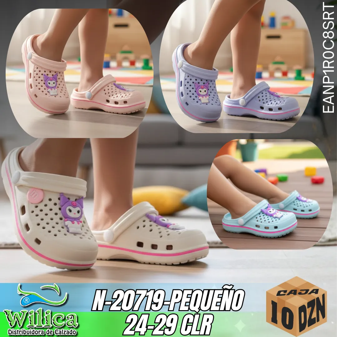🌈 El modelo N-20719-PEQUEÑO INFANTIL ofrece diversión y comodidad en un diseño tipo clog con correa ajustable. Sus aplicaciones decorativas con personajes infantiles convierten cada paso en una experiencia alegre y colorida.