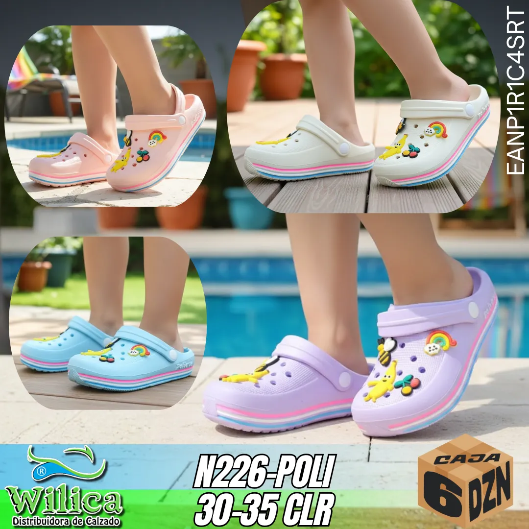 🌈 El modelo N-226-POLI INFANTIL ofrece diversión y comodidad en un diseño tipo clog con aplicaciones decorativas. Sus charms coloridos convierten cada paso en una experiencia alegre y veraniega.