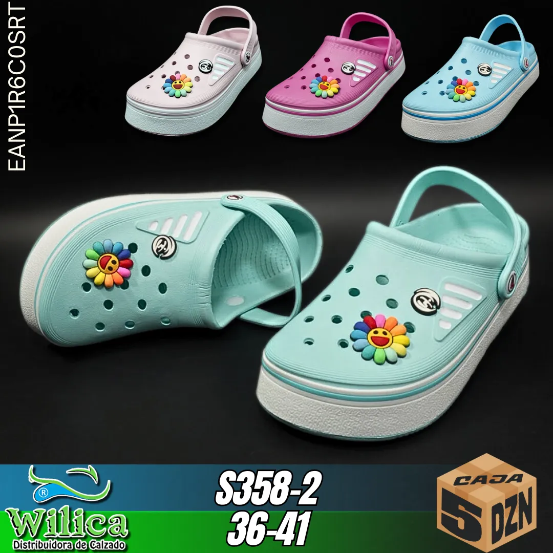 🌸 El modelo S358-2 presenta un diseño decorado con flor sonriente en la parte superior. Ideal para quienes buscan calzado cómodo con estilo tierno.