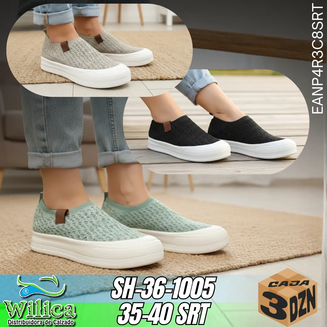 🌿 El modelo SH-36-1005 DAMA combina frescura y comodidad en un diseño slip-on con textura tejida. Su suela gruesa y ligera aporta soporte ergonómico, mientras que el detalle de tirador en la lengüeta añade practicidad y estilo.