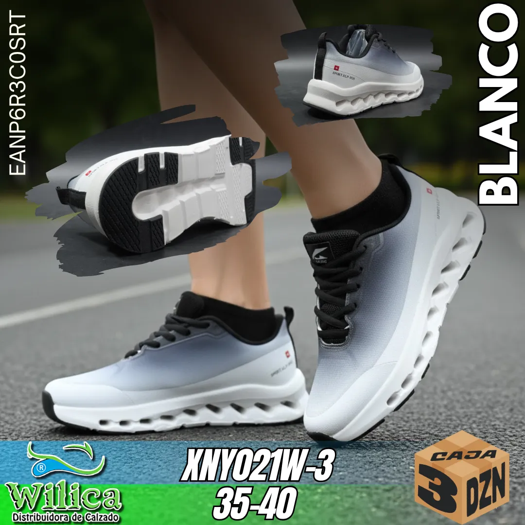 👟 El modelo XNY021W-3 presenta un diseño deportivo en color blanco con degradado sutil y suela de cápsulas. Ideal para quienes buscan calzado cómodo con estilo moderno y ligero.